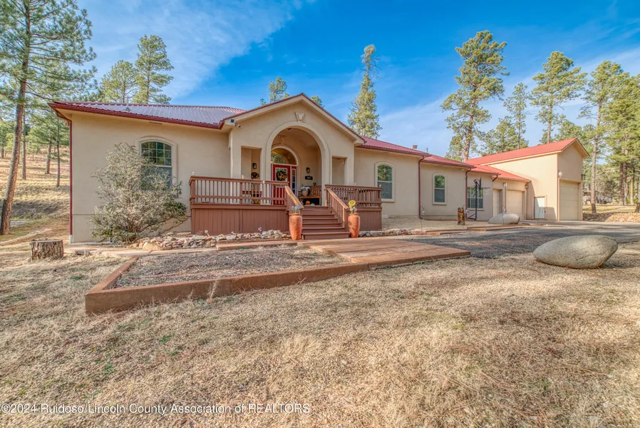 Welcome to this stunning 3-bed, 2-bath home in the highly sought-after gated White Mountain Meadows of Ruidoso, NM. Boasting 2,924 sq ft of living space, this home features updated stained concrete/vinyl floors, and a beautifully remodeled primary bathroom. Open concept kitchen with granite countertops. New AC/HVAC 2 years ago. Enjoy spacious living with a large game room, office, and plenty of storage throughout. The oversized 3-car garage provides ample parking and room for your cars and RV. Outside is partially fenced with grass/turf, along with a bar, tv, and grilling area great for entertaining. Set in a serene and safe neighborhood with large pine trees, this home offers both comfort and convenience. Don't miss your chance to own this gem in one of Ruidoso's most desirable areas!