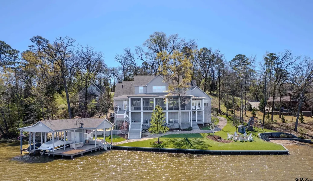 Stunning Waterfront Retreat in Lands End on Lake Cypress Springs! Beautiful drive-up through the majestic trees and fences of Timber Creek Ranch. With 285' water frontage, the beautifully landscaped setting offers breathtaking panoramic views and gorgeous sunsets! For year-round enjoyment, both street side and lakeside yards are covered in artificial grass, green all year and no mowing! Lakeside, you will find a two-stall boathouse, fire pit, play ground equipment and a small beach. The star of the show is the 863 sf retractable screened porch adding another dimension to the outdoor experience. It runs the length of the greatroom and kitchen with fireplace, grill, mini-fridge, living area and dining area, the perfect place to relax and oversee lakeside activities. The lower deck provides another large gathering area with hot tub, ping pong, an outdoor shower, sink and toilet. Designed for sleeping large families, there are 5 bedrooms, 4.5 baths in the main house and a large guest suite over the garage. From a lovely covered porch, step inside to a beautifully designed home with great attention to detail featuring the greatroom with a wall of windows, wood-burning fireplace and panoramic views. The gourmet kitchen features top of the line appliances, lovely cabinets, large island with breakfast bar, 6-burner Jenn-Air cook top and many more amenities. Off the kitchen is a half bath and well designed mudroom/laundry room/butler's pantry that runs from front to back, perfect for the necessities of lake living. Downstairs are the primary bedroom with lakeside deck and an ensuite guest bedroom. Upstairs are 2 guest bedrooms, two baths, and a large bunk room with 4 full-size bunks and 2 trundles. Coffee bar and mini fridge are in the upstairs hallway. Most enjoyable is the serene location of this home away from lake traffic allowing for hours of entertainment including boating, kayaking, paddle boarding, swimming and fishing! This exceptional home comes Fully Furnished!