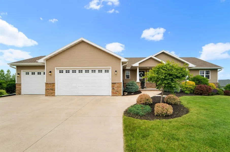 This walk-out split bdrm ranch is nestled on a cul-de-sac on a gorgeously landscaped .95 +/- acre lot! A covered front porch w/chartreuse plantings greets you & opens to the volume ceiling GR w/decorative floor to ceiling FP. Engineered hardwood floors flank the foyer and lead to the combination eat-in kitchen stocked w/cabinetry, SS appliances & granite counters. Dining area is flanked w/light from the patio doors that leads to a deck. Primary suite offers Tile walk-in shower, dual granite vanity & walk-in closet. Two additional bdrms, a full BA w/granite vanity & FF laundry complete this level. The LL is finished with 4th bdrm, 3rd BA, bar & theater room. Patio door leads to stamped concrete patio & fire-pit area. 3.5 car heated garage completes this home! 48 hrs for binding acceptance.