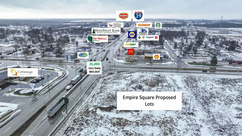 Welcome to EMPIRE SQUARE! The marquee development site of Central Wisconsin. Look no further if you want to feature your business at a busy intersection as over 25,000+ vehicles pass this property every day! From this location, you have access to local customers, commuters and passing through traffic. This area, with the new recent developments and the upcoming highway updates are going to see some real growth in the near future. Consider these lots to be primed position for a successful investment. This lot map is still in the conceptual phase of planning so if you need a custom shaped or sized lot then that can be negotiated as well. The Plover Area has a thriving economy and is in the midst of tremendous growth cycle. DNR Endangered Species Review and Phase 1 Environmental Reports are completed and are available upon request. Act now as these lots are prime real estate!