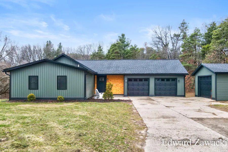 Welcome home to a beautifully renovated ranch in Rockford School district. Are you looking for a move in ready home in a natural setting with low maintenance≠ Conveniently located 5 minutes from downtown Rockford, right off 131. Right next to the White Pine Trail! This 2 bedroom 2 full bathroom has been completely updated with everything new! New roof, siding, windows, insulation, high efficiency furnace and central air, hot water heater, plumbing, and electrical as well as a new well pump and pressure tank. New kitchen cabinets with slow close drawers, and a custom built range hood. Quartz countertops, hex tile backsplash, and brand new high end stainless steel appliances make up the rest of the open concept kitchen. Everything has been renovated and made new in this home! Both Bathrooms have been updated with new tile and tub in one bathroom and a walk in shower with a retractable bench in the other. Move right in and enjoy the quiet setting and large deck off the dining room. This home also features an oversized master bedroom with walk in closets and ensuite bathroom. Stay out of the cold with the 2 stall attached garage and store your yard equipment and toys in the detached 3rd stall garage. Home warranty included in full price offer. Owner is a licensed agent.