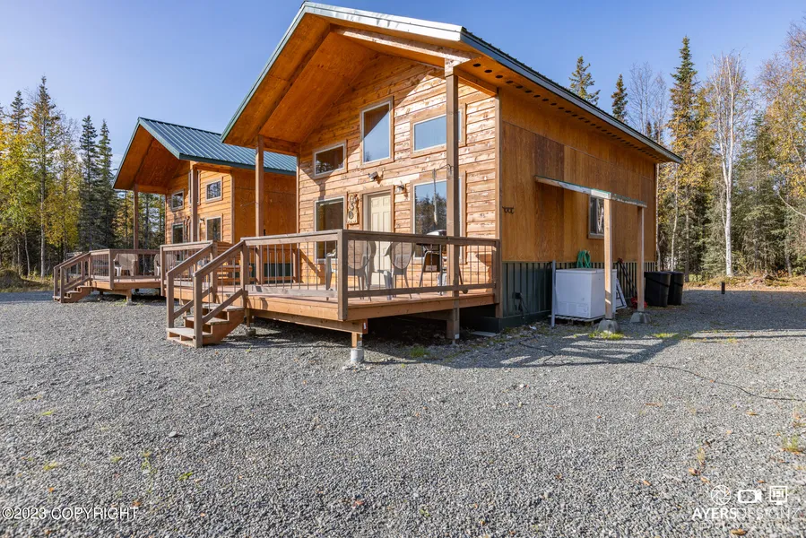 JUST WHAT YOU'VE BEEN LOOKING FOR! Custom-built 2018 & 2019 Schrock Construction cabins. Each cabin is 820 sq ft w/ 1 bed 1 bath + loft. Vaulted ceilings, stainless appliances, hickory cabinets, solid surface countertops, pine T&G, custom tile shower & SO MUCH MORE. Extra large gravel parking pad, 2023 built screened in gazebo + deck extensions on both cabins. TURN-KEY COZY ALASKAN CABINS!