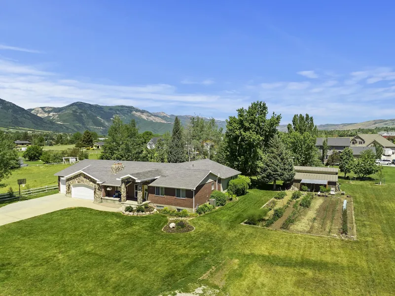 Centrally located in Eden on a nice quiet street. Home sits on almost an acre and has a large barn/shed for animals or toys (barn has a garage door on the back and can fit sellers 22 foot boat). Nestled on a generous lot, the home provides ample outdoor space for gardening, relaxation, and entertainment with its lush lawn and mature landscaping. The lot has automatic sprinklers and comes with one water share. There are peach, apple and pear fruit trees in the yard. Now let's talk about this amazing house. You have main level living, so you can grow old in this house and never have to move again. BONUS: A NEW Roof! Huge living room with a beautiful ceiling. Updated kitchen with double ovens and a butler pantry behind the kitchen with more counter space, cupboards and another sink. Primary bedroom is very spacious. Primary bath has two separate vanities and a jetted tub. Downstairs is where you can get creative and fit your needs. In the basement you have an additional living room and bedroom and exercise room. On top of that there is also a 850 square foot separate apartment that you can rent out. Apartment has its own walk out entrance. Garage has three bays but the third bay is extra long and can fit two cars lengthwise. This home promises a blend of comfort and serenity in one of Utah's most beautiful areas. Come envision your new beginning.