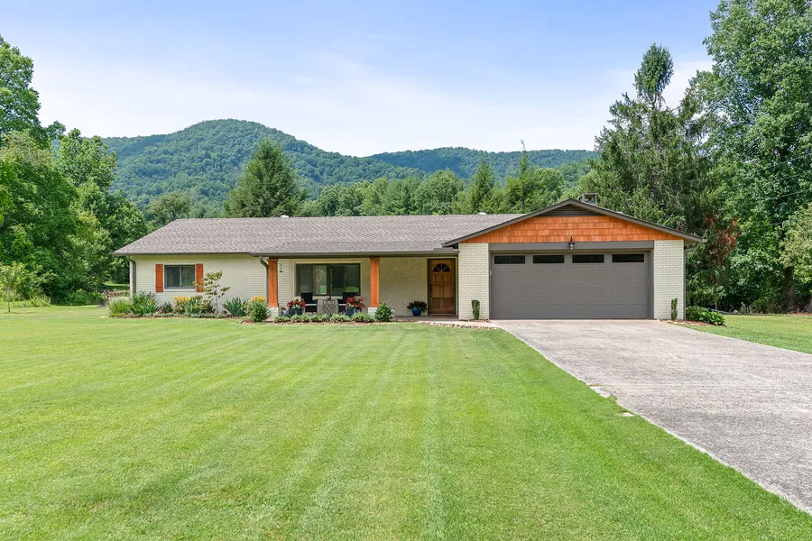 You've waited long enough; this is the mountain home you've been looking for. Surrounded by panoramic mountain views, this stunning contemporary renovation offers a light-filled, open floor plan with clean lines and upscale modern finishes. Enjoy a completely level-acre lot with running stream bordering the protected lands of Pisgah View Ranch State Park. Boasting high-end amenities blended with charming timepieces, like elegantly exposed brick accents, inviting fireplaces & leathered granite countertops. All major systems, roof, HVAC, insulation, plumbing, electric, windows and appliances have been updated. Ideal one-level living with custom features and a thoughtful split bedroom floor plan with adjoining home office off the main suite. Beautiful living spaces, designed for entertaining, blend to the outdoors with large sliding doors that open to a delightful veranda and private inner ...