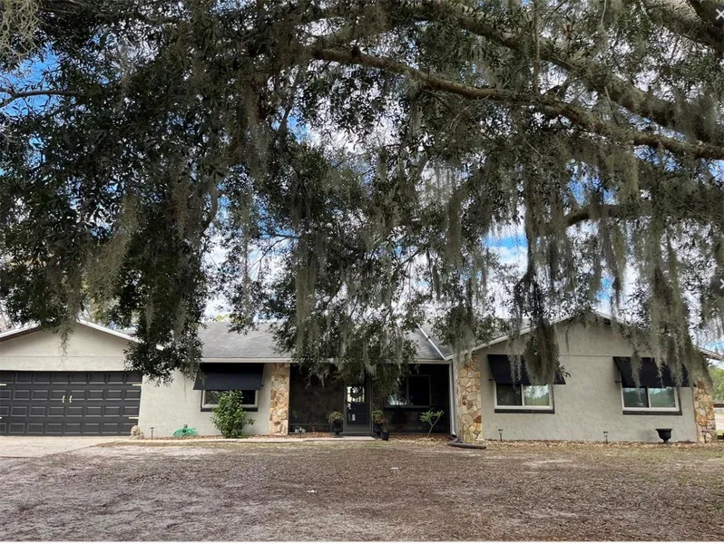 Must see to believe all that this charming updated, 3 bedroom, 2 bathroom, attached garage, pool home on a sprawling +/-1 acre lot that is zoned for horses has to offer. As you enter the house you are welcomed by a cozy screened in front porch. Enjoy the view of the tranquil lake as you sip your morning coffee. From there, walk through the front door into the spacious Great Room featuring new luxury vinyl tile which continues throughout the home. The wood burning fireplace with cedar wood mantle and masonry rock wall is a favorite spot for friends and family to gather. Vaulted ceilings adorned with decorative natural wood plank trusses and white washed cedar plank walls, are among the additional stunning details in the Great Room. To the left of the Great Room sits a beautifully renovated Kitchen featuring quartz counters, stainless steel appliances, ceramic tile backsplash, and oversized walk-in pantry. Off to the right of the Great Room is the hallway leading you to the Primary en-suite Bedroom and two secondary bedrooms with a shared bath. The highlights of the large Primary Bedroom are the crystal fandolier (a chandelier with disguised ceiling fan), a well appointed walk-in closet, and sliding glass doors that open up to the pool and lanai area. The Primary Bedroom en suite Bathroom has a large glass enclosed, ceramic tile, walk-in shower, and oversized vanity with sink and ample storage space. The secondary bedrooms each have a large window with scenic views of the park-like front yard. They share a large bathroom with shower and tub combo. A separate Laundry Room is located just off of the Great Room. As you exit the living space through the sliding doors you will walk out onto the pool deck. The fully screened outdoor pool oasis and the lanai area with retention wall offers plenty of space for large parties or a quiet spot for solo relaxation as you soak up the sun. Conveniently, the pool has its own bathroom to keep wet swimmers from entering the home. Beyond the pool area, you will find the fenced backyard, which has a stable and storage shed. The gem of this property is the unique, insulated, air conditioned 2250 square foot workshop. This space has a wood, framed mezzanine, plumbing, hook up, garage door and concrete flooring. The owners have converted it into a recreation area with a basketball court, as well as an additional party/ entertainment space. This property also includes a whole house plus workshop generator, Kinetco water, filtration system to go with the well water, no city utilities, Septic tank/well water. No HOA! This home has so much potential as an investment property, or your very own compound to live, work, and play! The property is close to I4 and conveniently located near OIA, golfing, and Central Florida attractions. Call to schedule your private showing. Mortgage is assumable.