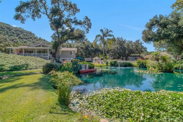 Monet's Water Lily Pond here in Fallbrook. One of the most well-known properties in Fallbrook is on the market! Enjoy the serenity and beauty of an 80x80 foot private pond in your own front yard. This highly sought after home boasts a truly breath-taking setting with mature trees, lush landscaping, lily pond with dock and so much more, all framed with a charming white picket fence. The entire property is just shy of one acres, providing an in ground jacuzzi, gazebo for dining al fresco and a large covered porch to enjoy the cranes fishing in the pond. Enjoy views over looking the pond and the renowned Pala Mesa Golf Course. Walking distance to Aquaterra restaurant and events hosted at the golf course. The interior of this charming craftsman style home offers 4 total bedrooms, with 3.5 bathrooms, granite counter tops in the kitchen and vaulted ceilings with exposed beams. In the master suite you will find floor to ceiling windows to take in the gorgeous views around you. The main level of the home also offers two additional bedrooms with their own private bathrooms. One bedroom provides a private patio over looking the yard and gazebo. A walk-out bonus room downstairs is perfect for entertaining and hosting events. Along with an additional room that could be used as a fourth bedroom or office space. Plenty of storage under the home along with a cellar for the wine collector in the family. A special property not to be missed, all offered with no HOA or Mello Roos. Welcome Home!