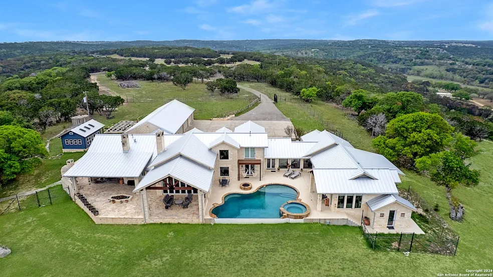 This stunning 124-acre live water Texas ranch is one-of-a-kind featuring a 6787 SF custom home with 7 bedrooms, 7 baths, and 2 half baths. The main house was fully renovated in 2019 and a large addition was completed in 2021. A new roof was installed in 2022 for the entire house. It's the perfect place for large family gatherings and entertaining sitting at 1,990' elevation, boasting breathtaking 20+ mile views through full opening glass doors in the living room and from every room. It is just 10 mins to Ke