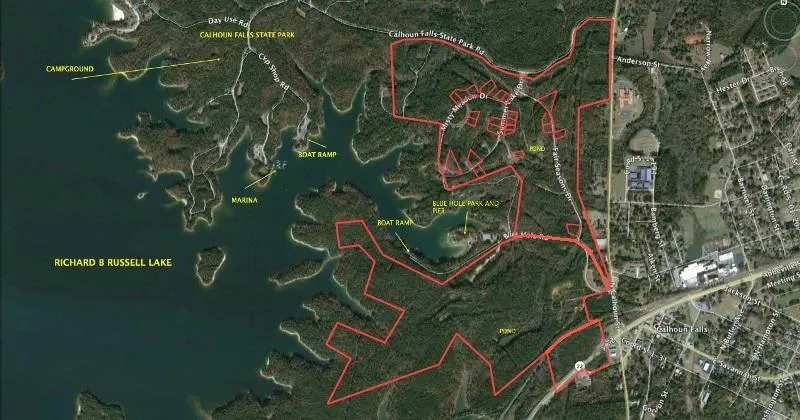 396 acres. Adjacent to the Calhoun Falls State Park (campground, boat ramp and marina), Blue Hole public boat ramp and park, and Richard B Russell Lake on the Savannah River. 1.2 miles of Richard B Russell Lake frontage (Corp of Engineers) with great lake views. Some utilities installed on site including power, water, sewer, and storm drain. 2.34 +/- miles of interior asphalt roads with curb and gutter. 1421ft of frontage on Highway 81/Calhoun Shores Pkwy. Water and sewer available Several ponds. Large timber and an old, abandoned "Author Hills" golf course. 120 finished lots. Tract must be sold as a whole, not individual lots.This information is not guaranteed by the seller or it's agents. Sold As-is.