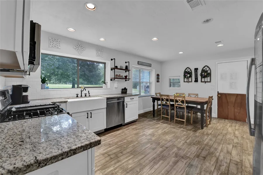 This 4 bedroom, 2.5 bath home sits on 35+ acres in Tarkington ISD. Inside, you'll find a spacious split floor plan with an oversized primary suite that includes a cozy sitting area. The living room features a fireplace and large windows that frame peaceful views of the back patio and open pastures. Outside, the land is ready for livestock with fencing, working pens and multiple barns. A charming schoolhouse-style building offers the perfect space for an office, studio, or guest quarters. With a fenced backyard, private ponds, and room to roam, this property blends comfort and country living.