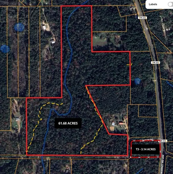 This property is a great unrestricted lot for a homesite. Over 61 acres of land to build your dream home and guest house, barns or any other storage or additional structures you may need. The property has roads on 2 sides giving you the ability to have multiple access points to get to your homes or buildings. The property has heavy tree cover to allow you to leave as much as you like for buffer or privacy. There is Electrical that wraps around the property for easy connectivity. Great place for a Hunting Camp or a homesite. Come take a tour today!! The property is divisible into 2 tracts if you look at the photos of recommended property split. There is an additional 3.14 acres for sale by the seller on Robison road and FM 222.