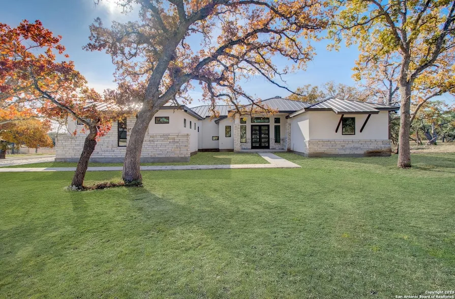 Welcome to your dream home in the picturesque community of Belle Oaks! This stunning new construction contemporary residence offers the perfect blend of luxury, efficiency, and modern living, situated on a sprawling acre of land. As you approach, the exterior boasts a sophisticated combination of stucco and a sleek metal roof, setting the tone for the chic design within. A grand entrance awaits through beautiful iron double doors, welcoming you into a world of elegance and comfort. This 4-bedroom, 3.5-bathroom home is meticulously designed with a focus on energy efficiency. Enjoy the convenience of a tankless water heater and the benefits of spray foam insulation throughout, ensuring your home remains environmentally conscious and cost-effective. The strategic location of this property is a true gem. Nestled between the charming town of Boerne and the vibrant city of San Antonio, you'll experience the best of both worlds. With an abundance of nearby retailers and restaurants, every convenience is at your fingertips. The interior of the home is bathed in natural light, thanks to strategically placed sliding glass doors that seamlessly connect the indoor and outdoor spaces. Step onto the covered patio, where you can host gatherings with friends and family, whether you prefer the comfort of the indoors or the beauty of the outdoor surroundings. This contemporary masterpiece is not just a home; it's a lifestyle. Immerse yourself in the tranquility of Belle Oaks while enjoying the modern amenities and thoughtful design that make this property truly exceptional. Don't miss the opportunity to make this house your home. Welcome to contemporary luxury living at its finest.