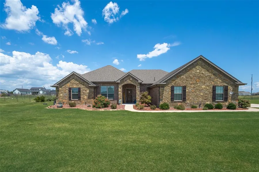 Dream Living in Caddo Mills ISD! Luxury 4-bedroom home, boasting immaculate living conditions, abundant upgrades, and beautifully landscaped. The heart of the home reveals an open floor plan, showcasing custom knotty alder cabinetry in the kitchen a with custom copper sink. Stainless, gas appliances with double oven. Cabinetry boasts pull out double spice drawer, pots and pan drawer, upgraded furniture-style granite counters, an oversized island and walk-in pantry with custom shelving. Relish in a spacious living area with an inviting gas-lit, wood-burning fireplace. The primary suite is generously sized, adorned with upgraded cabinetry and attractive tumbled travertine tile work, large shower and separate garden tub. Outdoor living is effortless, featuring a covered patio, propane BBQ stub for grilling, gutters, and an irrigation system. A 24x30 insulated metal building with 12ft doors, HVAC and a shop sink, a 20x24 gable for parking and 12x30 porch enhance the exterior!