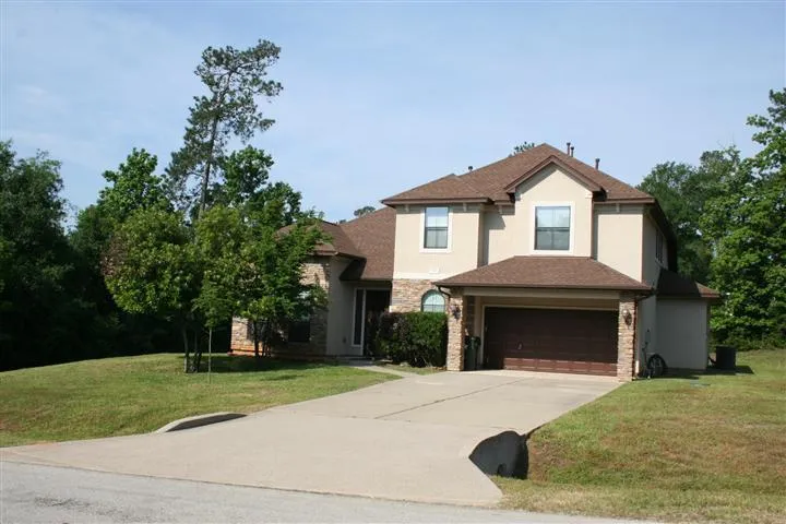 Family home on 1+ ac in a great location! 3/3, formal dining room, study, high-ceilinged great room with wood-burning fireplace. Master suite down. Upstairs: two bedrooms, one bath, gameroom and office nook. 2 car attached garage. Corner lot with home facing side street; wooded buffer on three sides. Small subdivision minutes from I-45 for easy access to shopping and amenities. Only 45 miles from downtown Houston. A great place to call home!