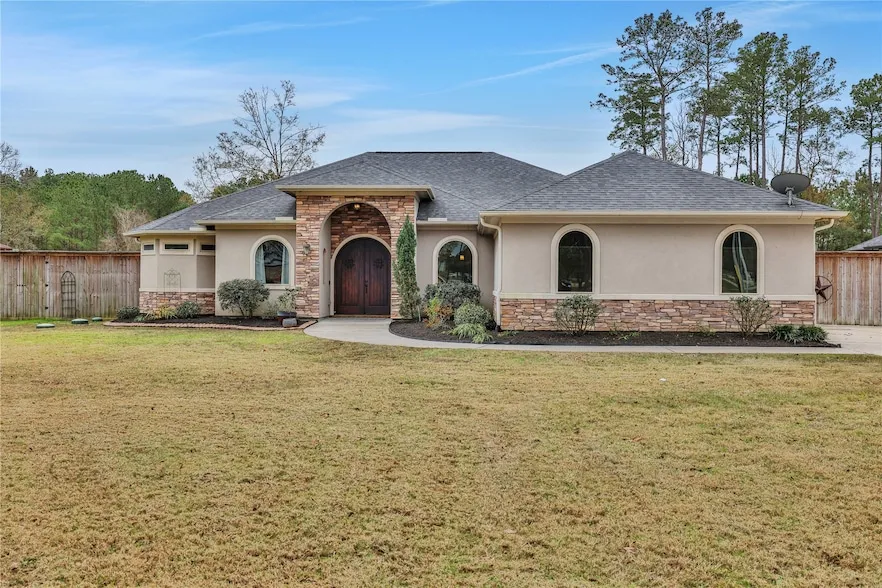 Stunning 4-bedroom, 3.5-bath home situated on a sprawling acre lot along the canal, offering a perfect blend of luxury and tranquility. The grand entry welcomes you with an arched knotty alder double front door, setting a sophisticated tone. Inside, enjoy gorgeous tile wood flooring throughout and an open-concept kitchen with a large island, custom cabinets, and modern finishes ideal for entertaining. The expansive primary suite is a true retreat, featuring a spa-like bathroom and a walk-in closet. Outdoor living is a dream with an oversized covered patio, a fully equipped outdoor kitchen, and an additional canal-side cooking and seating area. Canal frontage provides fishing and kayaking opportunities right from your own backyard. Cross-fencing provides security for your pets or your littles. RV pad and hook-ups create a convenient on-site storage opportunity. This one-of-a-kind property provides the perfect balance of space, comfort, and waterfront charm.