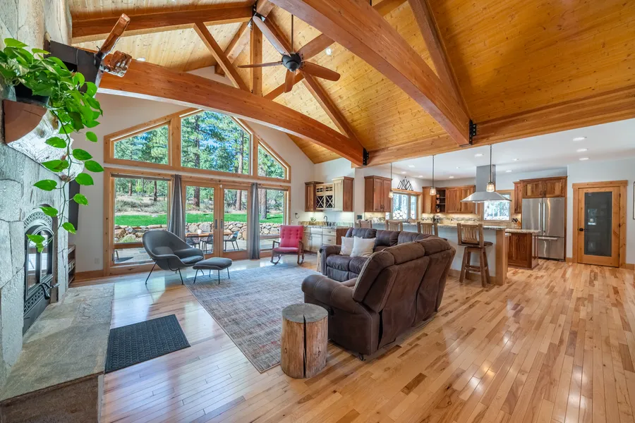 Located on over an acre amongst the tall pines with a 1,728 SF RV and mountain/lake toys garage. Built in 2016, this custom single story offers that niche mountain contemporary physique. Freshly reimagined landscaping boasts new expansive front to back yard with proper drainage system, paver patio, added walkway steps and entry sundeck for morning coffee. Detailed craftsmanship hosts Hickory hardwood floors, solid Alder doors, exposed wood beams, wet bar, and floor-to-ceiling rock wood-burning fireplace. All new landscaping also includes extensive rock walls, professional drainage system with French drains, dry creeks, and plumbed downspouts. The sprinklers/drip system are on WIFI control, and the custom redwood sun deck is newly constructed. Spacious dream garage is fitted for any mountain lifestyle including a 220 volt RV charging station. Smart home features recently installed allow f...