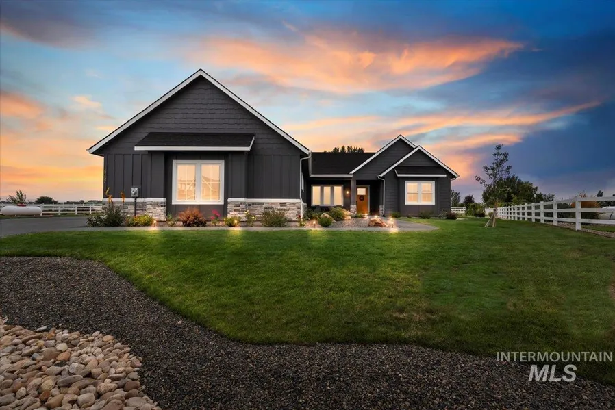 Welcome to this meticulously designed luxury home nestled on a private acre, filled with thoughtful upgrades and design features. The immaculate single-level home provides a better-than-new opportunity for the buyer looking for country living with city amenities. The well-designed floorplan features an open living concept with 4 large bedrooms and flexible office/5th bedroom. The kitchen is sure to impress with a massive quartz island, Bosch appliances, and ample cabinet space. Step into luxury with 10-foot ceilings, a spa-like primary suite, and premium LVP flooring. Soak in the surrounding mountain views from this one-acre parcel featuring a well-manicured lawn, fruit trees, raised garden beds, covered back patio, shed, an individual well and septic, and space to build a detached shop or RV garage. The 4 car garage features a locked room and built-in storage shelves. Walk to nearby Midway Park to enjoy all its fantastic amenities or head to Lake Lowell for outdoor recreation!
