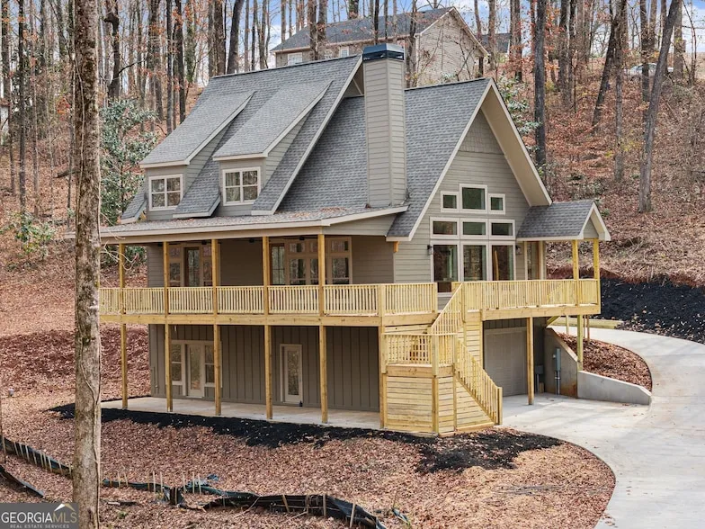 Experience luxury mountain living with rare Lake Lanier access in this brand-new construction home. Located in a quiet, private setting, this modern retreat features two natural streams in the front yard. Inside, the home is designed for comfort, style, and high-end entertaining. The oversized chef's kitchen includes premium finishes, abundant storage, and two dishwashers, making it ideal for large gatherings or everyday convenience. Enhanced lighting throughout highlights the home's craftsmanship and creates a warm, inviting ambiance. Enjoy year-round outdoor living on the large covered deck overlooking the front yard, complete with ceiling fans for added comfort. Perfect for entertaining, the home also features a gas-starter, wood-burning fireplace, creating the ultimate cozy mountain atmosphere. For future upgrades, the property comes pre-wired for a sauna in the basement and pre-wired for a hot tub outside, giving you the option to elevate your mountain-lake lifestyle even further. With its mix of modern amenities, peaceful natural surroundings, and direct access to Lake Lanier activities, this home offers the perfect blend of privacy, recreation, and luxury. Ideal as a full-time residence, vacation home, or investment property. A dock permit has not yet been applied for. Receive lender incentives when you utilize our preferred lender, Austin Saxon- Woodlake Mortgage.