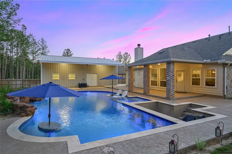 Step into your own slice of paradise on this 1.02-acre haven in Deer Pines, where luxury & entertainment reign supreme! The heart of this home is the backyard oasis. Take a plunge in the custom inground pool with a swim-up bar, beach entry, cascading waterfall, & more. Relax in the deluxe spa, then fire up the grill in the sunken outdoor kitchen area – the ultimate spot for epic poolside parties & summer BBQs. Indoors, enjoy modern finishes like granite countertops and sleek vinyl plank flooring in the open layout for seamless entertaining. Don't forget the 24x40ft insulated metal building offering endless possibilities for storage, tinkering, $ more. With a 3-car garage & extended driveway, there's plenty of space for all your vehicles & outdoor toys. Plus, with numerous upgrades, no MUD & low taxes this property is one you won't want to miss. Located just East of Conroe, here you're a ...