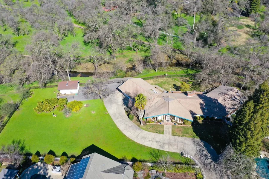 If you're seeking an acre lot, that backs to an expansive green space, creek + trails, with a quiet-feeling court-like setting, and gated entry - this home is the space for you. Pride of ownership radiates from all the nearby homes. A serene, lush compound where you'll often hear the sounds of nature. Plenty of room for expansion or pool (flat usable lot). Trees by the basketball hoop are bursting with oranges (also incl. mandarin trees). Lg outbuilding is great for storage/workshop. Inside, seller has introduced new light fixtures to bring more mid-century modern appeal to the home. Panoramic, calming views out nearly every window. How gorgeous is that breezeway? There are a few fish buddies that keep stream in pond-mode. Expansive 3-car garage incl. 1/2BA. Seller added fencing to back perimeter. Close prox. to restaurants, stores, Oakmont HS (health academy), + Maidu Park (skatepark, b...