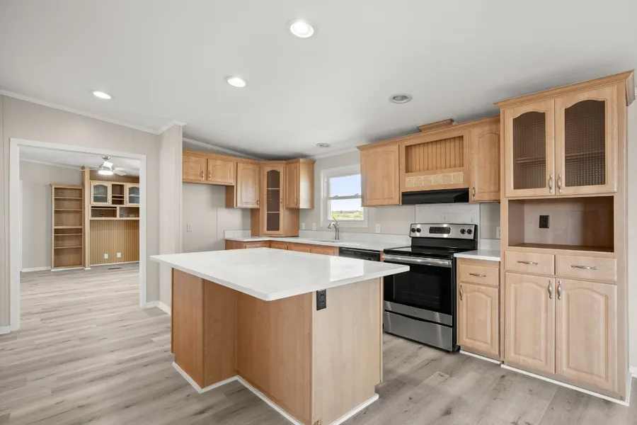 Nestled on a full acre of land, this stunning 4-bedroom, 2-bathroom manufactured home offers the perfect balance of comfort, space, and modern elegance. Step inside and be greeted by an open-concept layout, where natural light pours in through oversized windows, highlighting the sleek quartz countertops and abundant cabinet space in the kitchen. The oversized island is perfect for entertaining, meal prep, or casual dining. The primary suite is a true retreat, featuring a remote-controlled ceiling fan, a bonus room perfect for a home office, nursery, or cozy sitting area, and a luxurious en-suite bathroom. Unwind in the freestanding acrylic alcove bathtub, enjoy the dual vanity, or refresh in the walk-in shower-all complemented by a spacious walk-in closet. On the opposite side of the home, three generously sized bedrooms share a full bathroom and are connected by a massive second living ...