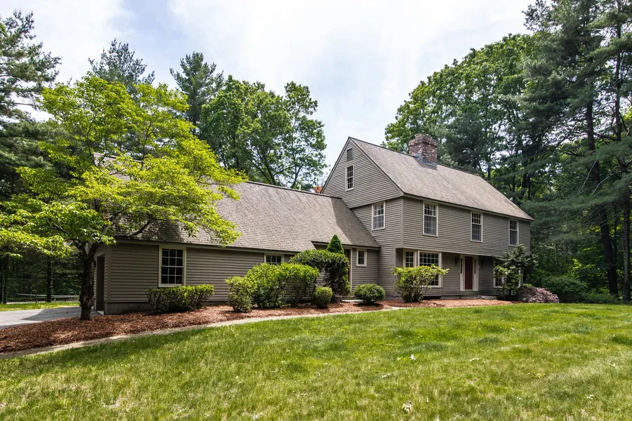 Original Owner custom built home by James Grenier in 1979 on 1+ acre of privacy complete with its own tennis court. This well maintained antique reproduction colonial has a new cherry cabineted kitchen (about 10 years), with granite countertops and stainless steel appliances. The kitchen has a generous eating area and is open to a beamed ceiling fireplaced family room. The formal dining room with a large walkout bay window is close to the kitchen and perfect for entertaining, especially during the holidays. If you want to spend some quiet time alone relaxing or reading a good book, sit by the fire in the 24' fireplaced living room and enjoy the views from every window. There are 4 bedrooms, 3 full bathrooms, and a large laundry room/walk-in closet on the 2nd floor plus a 22'x19' quiet and private great room perfect for watching your favorite sport on TV. It can also serve as a separate i...