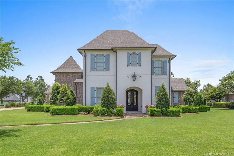Two Story Country French inspired home situated on a just over one acre corner lot on the golf course in Graywood Plantation. Design includes brick accents, reclaimed wood beams and wood flooring throughout. A warm and inviting space, it is infused with current transitional styling. Handsome bricked foyer leads to living room with fireplace flanked by builtins, all overlooking gorgeous pool and outdoor living space. Dining room creates a casual living environment as it opens to the well appointed kitchen with painted cabinetry and oversized working island with bar seating. Gas stove with double ovens, pot filler, builtin refrigerator and separate freezer with additional wine cooler. Roomy pantry, coffee bar and additional wine storage room. Primary ensuite is downstairs in addition to a second ensuite off the foyer. Primary is tucked away and features brick accent wall and stylish bath w...