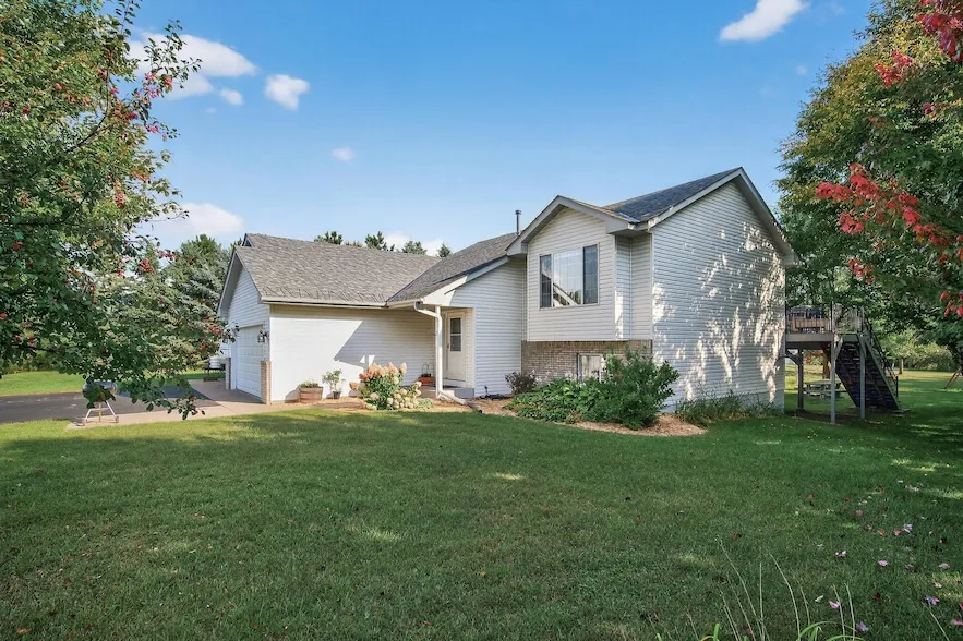 Sellers providing a ONE YEAR HOME WARRANTY through Choice Home Warranty. Nestled at the back of a quiet North Branch neighborhood, this split-level home on just over an acre offers the rare combination of privacy, modern updates, and room to grow. The home s thoughtful floorplan welcomes you with light-filled living areas, refreshed with new flooring and carpet. The kitchen showcases stainless steel appliances and opens to casual dining and gathering spaces. Step down to the walkout lower level, where you ll find a family room, custom-tiled bath, and a versatile office with built-in hickory cabinetry ideal for remote work or creative projects. Outdoor living shines here. Two spacious decks including one with low-maintenance composite materials overlook a backyard designed for enjoyment. Mature shade trees, eight apple trees, and a swing set create a park-like retreat. Two sheds provide storage, while the concrete RV pad and oversized 3-car garage give you room for all your hobbies and equipment. With 1.032 acres, framed by towering pines for natural privacy, this property blends the charm of country living with the convenience of a neighborhood setting. It s more than a home it s a lifestyle waiting for you.