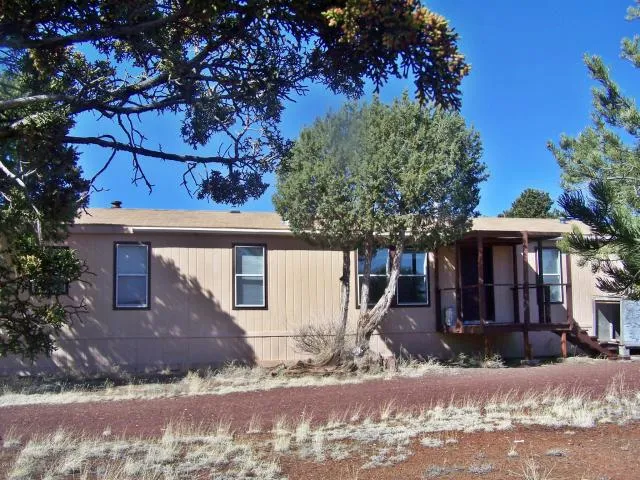 This is a roomy 3/2 M.F.home on a fully fenced nicely treed Pinon Pine covered 1+ acre. It has a split floor plan with fire place and wood burning stove in the living room. There is a combined living room, dining room combo and a small kitchen dining area with adjoining separate laundry room. Three small patios, one on each end of the house in addition to the entrance into the home adds a special touch to the home. It is complete with a circle drive, county maintained roads, fire dept. and farm animals are welcome.(except swine) It is only 20 minutes north of Williams with year round state and county maintained roads. In addition it is less that 1 hour from the Grand Canyon! All this home needs is you and a little TLC.