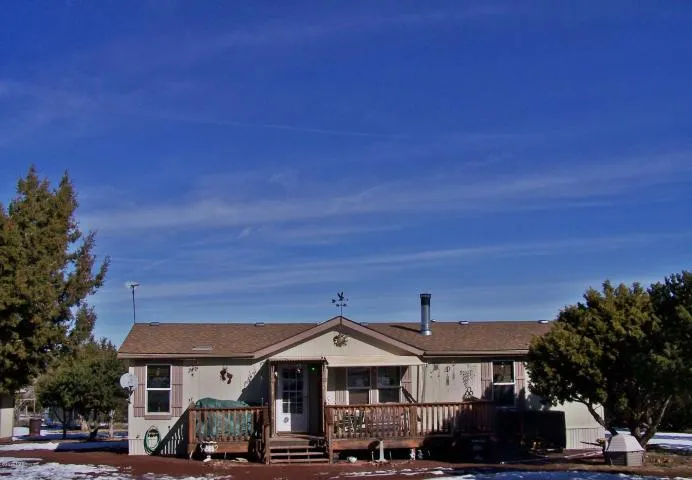 This charming home is situated in Junipine Estates just north of Williams. The roads are paved up to the sub division and are county maintained. The home makes the most of its surrounding rural atmosphere where you can take in the pure, clean air of the country, relish the stunning panorama spectacular views that continue into the distance for miles. You will enjoy gorgeous views of the north rim of the Grand Canyon from the back deck which is perfect for casual entertaining. The combined casual dining room, living room and kitchen space makes up the largest room in the home. A desirable feature of this property is that it is perimeter fenced and also has corrals for horses, 4 storage sheds and a workshop. Floor coverings include rich pergo in the living room/kitchen and dining area. The 3 bedrooms have carpeting. a toasty open fireplace is perfect in winter and the home is double insulated keeping the home warm in the winter and cool in the summer. You will also enjoy the faux fireplace/heater on the wall next to the dining area. Both decks, front and back, have the convenience of sunsetter awnings. Ceiling fans throughout the home just add to the ambiance. This home could be a possible short sale. Bring your offers today.