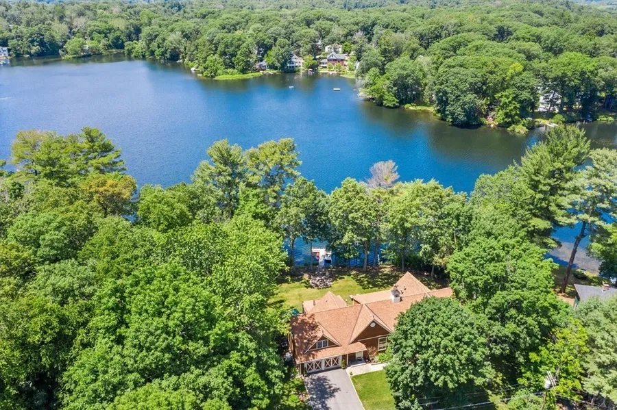 Stunning Waterfront Contemporary with panoramic views of Dudley Pond. Gorgeous sunsets! Thoughtfully renovated and expanded, this home is perfect for entertaining, relaxing and enjoying all the splendors of waterfront living. Remarkable interior architecture is bright, open and airy. Welcoming front foyer leads to an open-concept kitchen/dining/living space w/ soaring ceilings, two-story stone fireplace and walls of glass capture the Zen-like setting. Fabulous sun room. Dream first floor master with water views offers gas fireplace, luxurious marble bath & huge walk-in closet. Upstairs includes a sunny family room, three bedroom suites, two of them include a gas fireplace & private balcony. Incredible level backyard with expansive lawn, blue stone terraces & firepit. A path leads to a large shoreline on the pond with a dock for swimming and mooring boats.1.03 acres. 2 car garage. Conveniently located to major routes, airport and Boston. Top Rated Wayland Schools. Offers due June 28,5PM