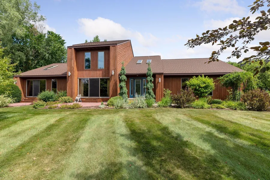 Gorgeous park-like setting for this 4 BD/3 BA/ 3 car garage beauty. All main floor living with expansive kitchen, dining and living areas. Large family room with gas burning fireplace overlooking the backyard. Access to the deck perfect for grilling and outside entertaining. Granite counter tops and stainless steel appliances in this stylish kitchen perfect for entertaining large groups. Main floor master suite with adjacent office/nursery or bedroom, plus another full bath. Stunning vaulted ceilings. Beautifully updated 3/4 bath upstairs along with 2 bedrooms, one includes skylights. Andersen windows throughout. New AC, new FP and new Hunter Douglas blinds. Amazing wall of patio doors facing south for plentiful sunshine during those long winter months. The yard is tastefully landscaped with perennials. This one of a kind home will not last long!