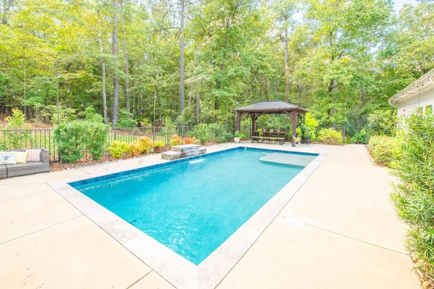 Your Private Oasis Awaits: Spacious 5-Bedroom Home with Gunite Inground Salt Water Pool! Escape to your own private oasis in this stunning 5-bedroom on main level home, featuring a bonus room upstairs and 4 full bathrooms, all nestled on just over an acre of serene landscape! Enjoy sunny days by the inground swimming pool, complete with a tranquil water feature and pavilion, or relax by the firepit! Welcoming rocking chair front porch with stained wood ceiling! As you step inside, you are welcomed by a foyer adorned with hardwood floors that flows gracefully throughout the main living areas and bedrooms and a barn door that leads to a versatile office space, which can easily serve as a den or study, providing the perfect spot for work or relaxation! The open and split floor plan is perfect for modern living, highlighted by a spacious living room with a vaulted ceiling, exposed wood beam, and a cozy gas fireplace flanked by built-in shelving! Large windows offer beautiful views of the covered back porch with stained wood ceiling, creating a bright and inviting atmosphere! The chef's kitchen is a dream come true, featuring an island with a snack bar, nice granite and quartz countertops, a farmhouse sink, and a gas stove with a stylish vent hood! Additional amenities include a tiled backsplash, pantry, convection oven, microwave oven, wine fridge, and dishwasher! The adjacent dining room, complete with crown molding, is perfect for hosting meals! 'Bathroom floors on the main level are heated!' Retreat to the luxurious owner's suite, which boasts a tray ceiling, ceiling fan, and a spa-like bathroom featuring two fabulous vanities, an accent wall, and a stunning tiled shower with two shower heads, including a rainhead! Enjoy a standalone tub with a custom faucet, a spacious walk-in closet, and a private water closet! The home also offers four additional spacious bedrooms, each with ceiling fans, and two full bathrooms that are perfectly situated to mirror each other, allowing two bedrooms to share each bath! Both bathrooms have stylish vanities and mirrors, tiled surround showers, and tiled floors! Upstairs, the bonus room provides versatile space for a playroom or home office, complete with its own full bathroom featuring a granite-top vanity! The laundry room has ample folding space and a mudroom with a mudbench and cubbies for organized storage! A side entry 2-car garage with workshop space plus extra parking space! Lifelong metal roof, gutters & sprinkler system!