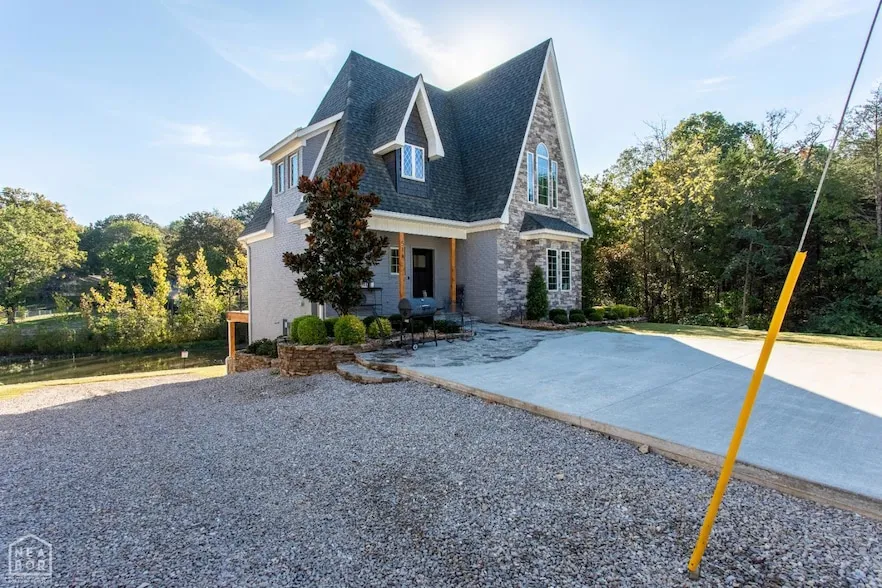 Lake House nestled at the tranquil waters edge of Lake Thunderbird in the picturesque Cherokee Village, Arkansas in Sharp County AR. This enchanting Storybook Cottage blends Whimsical charm with modern elegance. Construction completed early 2024, this newly constructed gem offers a unique and serene retreat for all who seek a peaceful escape. The main cottage consists of 2098 sq ft, 3 bed 3 Bath and the whimsical architectural details, soft gray exterior of brick and stone with a touch of cypress natural wood accents are very inviting. The lush landscaping surrounding the property enhances its fairytale allure. Open Concept with a high vaulted ceiling also accented with wood cypress beams, bathe in natural light, showcasing the high ceilings and custom finishes. The living area features a gas log fireplace and has 2 exterior doors to access the large back deck, neatly lined with steel bl...