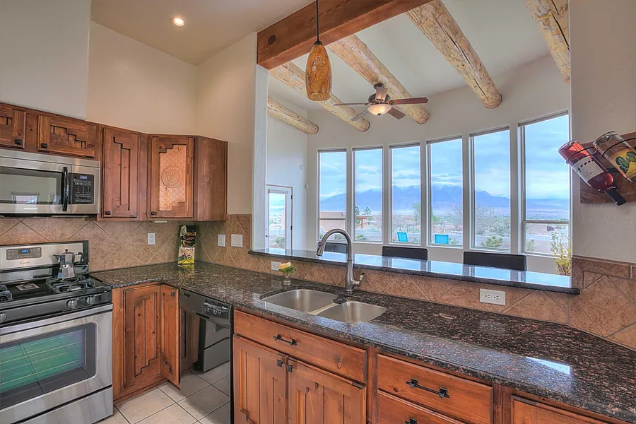 AWARD WINNING Custom home! Situated on over an acre!*ELEVATED MILLION DOLLAR VIEWS*PRIVACY* Large island kitchen with upgraded stainless appliances and gleaming granite counters. Custom cabinets w/copper inserts, overlooking the great room featuring: a sweeping wall of curved windows, scraped wood floor, raised ceiling, suspended shaved vigas & hand plastered fireplace. The master retreat has a hand carved beamed ceiling & private view patio. *REJUVENATE in the SPA Inspired spacious master bath featuring custom tile, a dual headed shower and large tub. HUGE walk-in closet. Newer refrigerated air and furnace. Fully landscaped with grass, trees, roses & wisteria. MANY CUSTOM EXTRAS! Circular entry skylight, intricate entry medallion, stacked stone accents. *PRIVATE PAVED ROAD* *A WOW HOUSE*