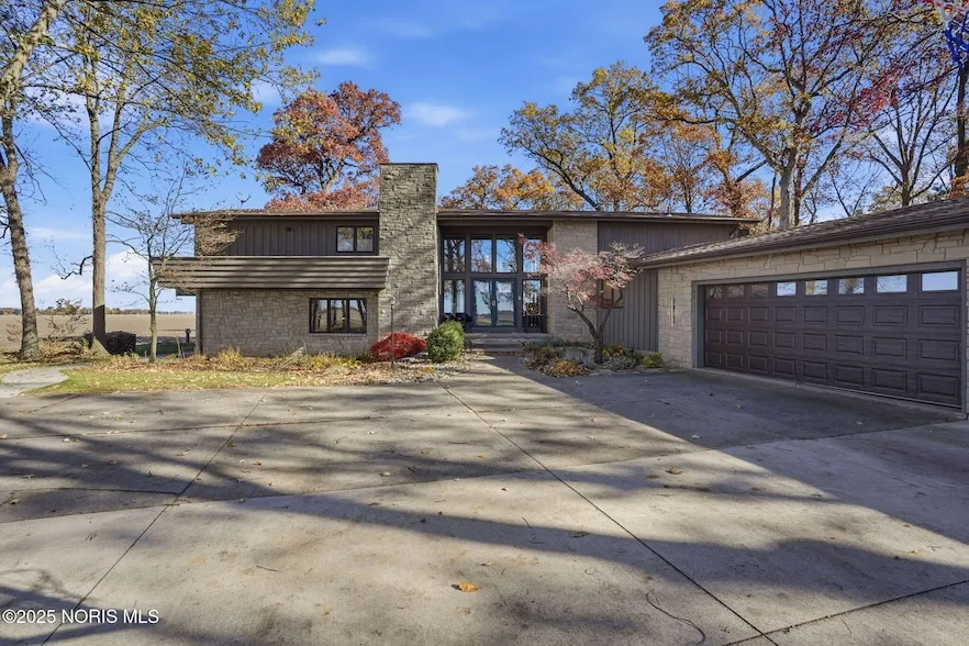 Architectural Excellence on an acre in Bowling Green set amid mature trees and lush landscaping, this contemporary residence brings modern sophistication to the quiet countryside of Bowling Green. Built in 1976 and recently transformed by Mavillino Homes, the property blends striking architecture with thoughtful updates that honor its original design while elevating every detail. A flexible floor plan allows the unique potential for this home to suit a multi-generational housing need with viable secondary living suite (primary bed/full bath, office and living space with kitchenette already plumbed in). Inside, light pours through floor-to-ceiling windows, accentuating cathedral ceilings, stone accents, and an open floor plan designed for both privacy and connection. Established landscape welcomes guests to the front door. The foyer welcomes with new tile flooring and a sleek European-style closet system that sets an immediately refined tone. The primary suite, tucked in its own private wing, offers a sense of retreat with a spacious walk-in closet, double vanity, and direct access to the courtyard - shared with an adjacent office that's ideal for working from home. This level also allows the unique potential for multi-generational housing with kitchenette already plumbed in. The office on this level is complimented with a stone fireplace and continuous LVT flooring. Upstairs, each of the three additional bedrooms open onto the wraparound balcony, while a newly added wet bar ensures guests feel entirely at home. The second floor shares a jack and jill bathroom with full custom finishes highlighted by undercabinet lighting, heated & lit mirrors and private walk in shower. The jack and jill connects one bedroom (potential second primary) and the second floor hallway. A flexible loft overlooks the dining and living space perfect for second office, casual living or play space. The kitchen impresses with granite countertops, custom cabinetry, a breakfast bar, and a generous wall of pantry space. A functional half bath, work space and spacious utility room separate the kitchen and three car attached garage. A finished (not heated or cooled) loft makes for good future space or storage in addition to the basement. Smart-controlled lighting, modern fixtures, and custom railings accentuate the home's architectural character, creating a seamless blend of form and function. All appliances (washer and dryer only a year old) and lawnmower (only a few years old) will remain with the home. Positioned minutes from the energy of downtown Bowling Green yet surrounded by nature, this home offers a rare balance - modern living in a timeless setting. This home is perfectly situated for commutes to both Toledo and Findlay. Request a complete list of upgrades and renovations.