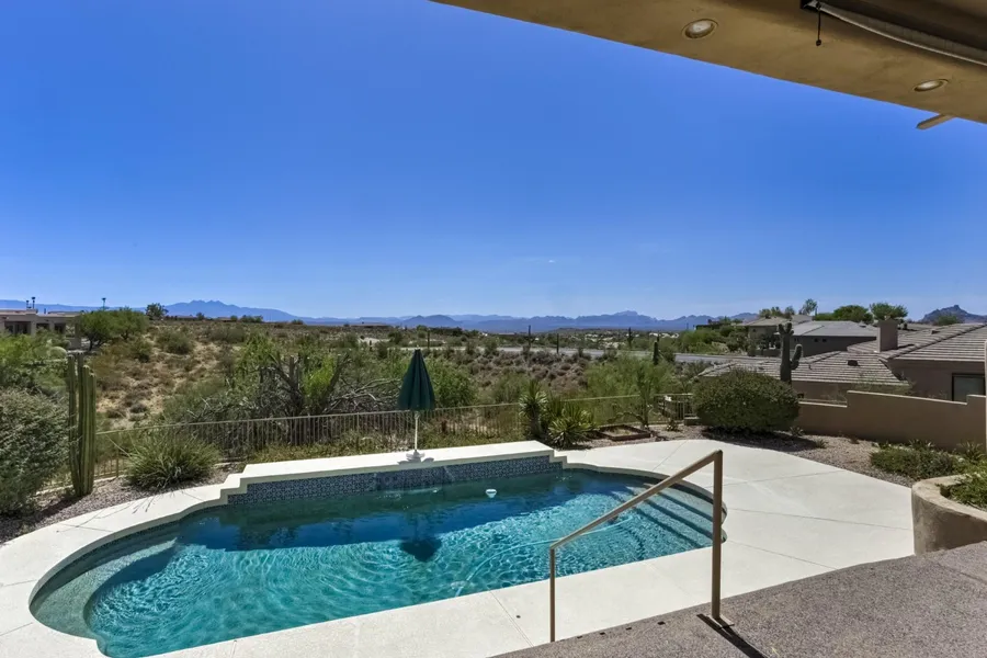 Wow, do not miss this fantastic single level property nestled on a quiet cul-de-sac within Fountain Hills. Step inside and instantly notice the open formal living and dining room with walls of glass framing majestic views of Red Mountain, the world-famous fountain, and Four Peaks. Open to the family room, the window-lined chef's kitchen is sure to please with an oversized stainless steel refrigerator, stunning tile flooring, and plenty of counter space. Inspire daily rejuvenation from the massive master suite complete with private pool access, updated wood flooring, fireplace, dual vanities, oversized tub, water closet, and updated glass shower. Completing the interior, three en suite bedrooms and an office combine both functionality and convenience. Perfect for any Sonoran Season, the backyard is a true oasis complete with lush foliage, a large covered patio, and sparkling pool with waterfall.