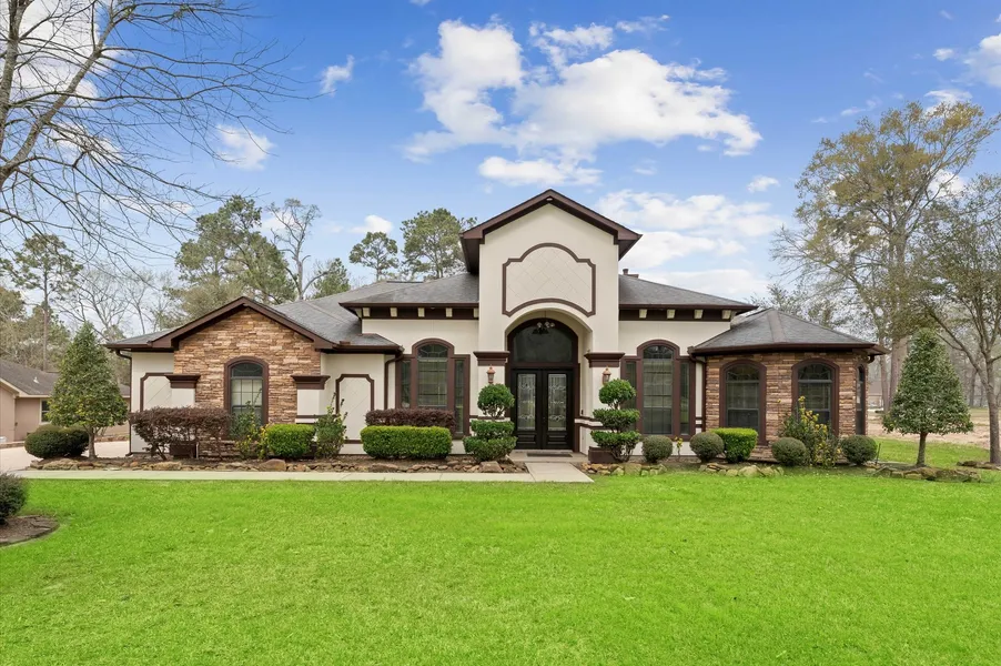 Nestled on an expansive 1+ acre lot, this residence boasts a refined blend of stone and stucco architecture, exuding timeless elegance and curb appeal. Mature trees and lush, professionally designed landscaping create a serene, park-like setting. Step inside to discover soaring domed ceilings, elegant interior columns that add architectural distinction, and a palette of freshly updated neutral tones that highlight the home's striking finishes. Every detail speaks of craftsmanship and care. The gorgeous primary bedroom features rich hardwood flooring, a charming bay window that floods the space with natural light, dual walk-in closets with custom built-ins, and a spa-inspired ensuite bath designed for ultimate relaxation. Host unforgettable gatherings on the expansive covered patio, complete with a built-in pit barbecue and a private guest suite with separate entry ideal for visitors or multi-generational living. Additional highlights include a detached garage for extra storage space.