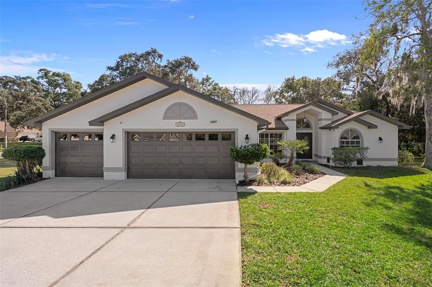 Under contract-accepting backup offers. This is the one you've been waiting for! This custom home in the scenic Autumn Oaks subdivision has been fully updated this year. Featuring all-new flooring, an updated kitchen and bathrooms, fresh paint inside and out, and so many other thoughtful details, this stunning home is ready for you to move right in and enjoy the sparkling pool. From the moment you arrive, you ll appreciate the extra parking afforded by the corner lot not to mention the beautiful grove of trees in the backyard. Step through the double front doors into a bright, open living space with brand-new luxury vinyl plank flooring and cathedral ceilings. The updated kitchen offers stainless-steel appliances, soft-close cabinets, and quartz countertops. The primary suite provides a peaceful retreat with a luxurious en suite bathroom featuring a walk-in shower, jetted tub, dual vanities, a generous walk-in closet and linen closet. Three additional bedrooms on the opposite side of the home provide privacy and ample space, with one thoughtfully designed as an in-law suite. The hall bathroom, shared by the other two bedrooms, offers convenient pool access. The pool includes an electric heater for year-round enjoyment. Autumn Oaks is a well-established community known for its custom homes and tree-lined streets. Each home sits on at least half an acre, and while the neighborhood HOA fee is very low, it includes a wide array of amenities: tennis, pickleball, bocce, and basketball courts, plus a playground, picnic and grilling areas, restrooms, and community sidewalks with street lighting. Conveniently located on the Pasco/Hernando County line, you ll enjoy quick access to US 19, the Suncoast Parkway, major shopping centers, restaurants, Tampa, and Tampa International Airport.
