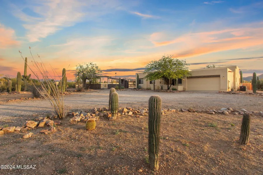 Welcome to 2805 N Lloyd Bush Drive, Tucson, AZ 85745- your private paradise where luxury meets rustic charm. Nestled against breathtaking mountain views and mesmerizing sunsets, this extraordinary home perfectly blends the cowboy spirit with Santa Fe elegance. Step through the serene front courtyard into a world of natural desert beauty. The expansive open floor plan welcomes you with a spacious living area, featuring vaulted ceilings and abundant natural light. Every room in this home offers stunning mountain vistas, creating an atmosphere of tranquility and elegance. The cozy wood-burning fireplace invites you to unwind in a warm, inviting setting. The chef's dream kitchen, adorned with exquisite granite countertops, seamlessly flows into the dining area. Here, you can savor incredible