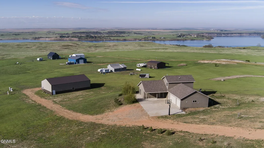Welcome to your dream retreat on the quiet shores of Lake Tschida! This custom-built, 2-story patio home offers quality and comfort at every turn to enjoy year-round living or as summer get away. Discover a showcase of craftsmanship, with custom-built cabinets, solid wood trim and doors that add a timeless feel. The cathedral ceiling lend an airy feel to the living space, while four walkouts invite you to seamlessly transition to the covered patio, where breathtaking lake views await. Imagine preparing meals either inside or outside while enjoying panoramic views of the lake just beyond your doorstep. Open main floor layout includes kitchen, dining, and living room with a main floor primary bedroom, full bath, and a handy laundry/mudroom area. The upper level offers a second full bath a two bedrooms to easily accommodate your summer guests. Situated on an owned, 1-acre lot, this property is a true haven for recreational enthusiast. A 40'x64' shop provides ample space for hobbies or boat storage, while a convenient 3-stall attached garage offers parking and workspace. Outside, indulge in the ultimate lakeside lifestyle with a nearby sandy beach or switch gears and enjoy the 7,575 acres of public land at the Heart Butte Reservoir that offers abundance of wildlife for hunting, fishing and viewing opportunities year round. Stretching along the shoreline, the expansive beach features a gradual drop into the waters, perfect for swimming, sunbathing, or simply enjoying the lake setting. Whether you're entertaining guests on the patio, unwinding in the welcoming interiors, or exploring the beauty of the lake, this exceptional home offers an unparalleled retreat for those seeking the epitome of lakeside living. Don't miss your chance to experience the best of both worlds - schedule your viewing today and make this lake home your own!