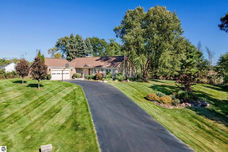 Nestled on the picturesque Old Mission Peninsula, this attractive brick ranch-style home offers a perfect blend of comfort, privacy, and convenience. With 3 bedrooms and 2.5 baths, including a master bedroom with a newly remodeled ensuite bath, this well-maintained property is move-in ready. Fresh paint throughout the home, new carpet in all bedrooms, new lighting, and brand-new appliances add a modern touch to this charming residence. The spacious layout is perfect for main floor living, featuring a formal dining room, a cozy sunroom that leads to a lovely large backyard deck with retractable awning, and large windows offering views of the pond and beautifully landscaped property. Underground sprinklers keep the grounds lush, while mature trees provide privacy and a serene atmosphere. An additional buildable lot offers potential for development or extra space for even more privacy. Inside, the gas fireplace connects the living room and dining room creating a warm, inviting ambiance. The basement is partially finished providing for a recreation room and the workshop and ample storage space offer versatility for hobbies or extra living areas. The attached heated 2-car garage provides convenient access, while the covered front porch is perfect for enjoying the tranquil surroundings. Enjoy hiking Pelizzari Natural Area just steps from the house. Located close to the peninsula's renowned wineries, beaches and all that Traverse City has to offer, this home is a true retreat while just being minutes from town. Perfect for those seeking a peaceful, updated home with plenty of space and a prime location.
