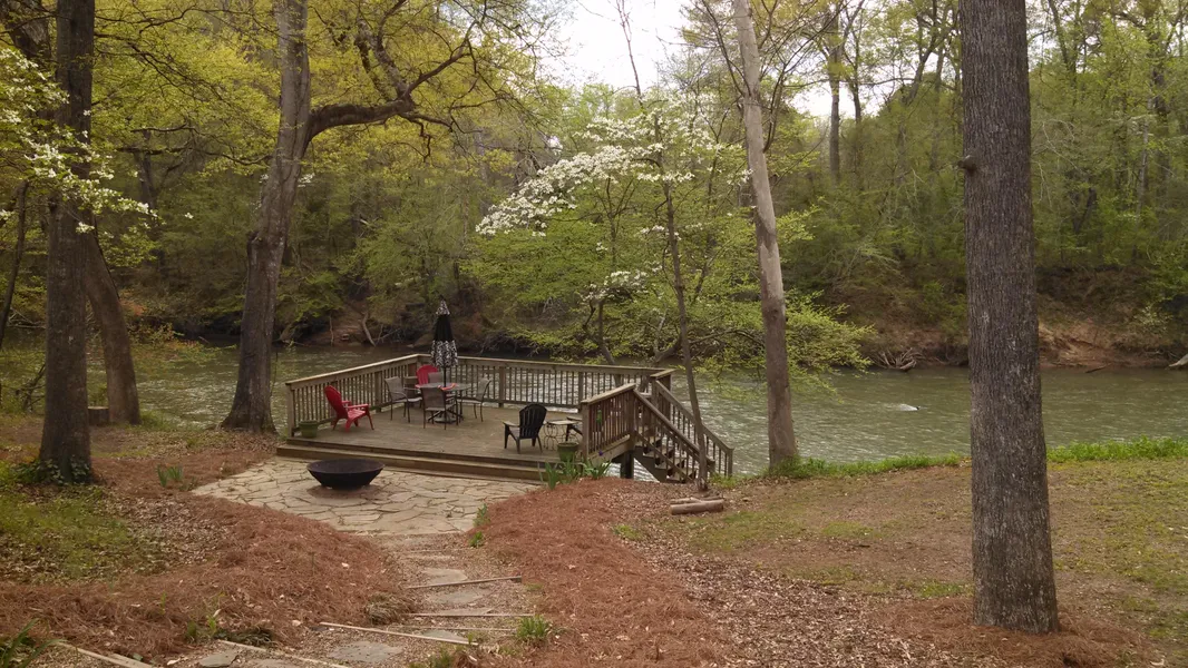 Large wooden deck and stone patio area overlooking the river.