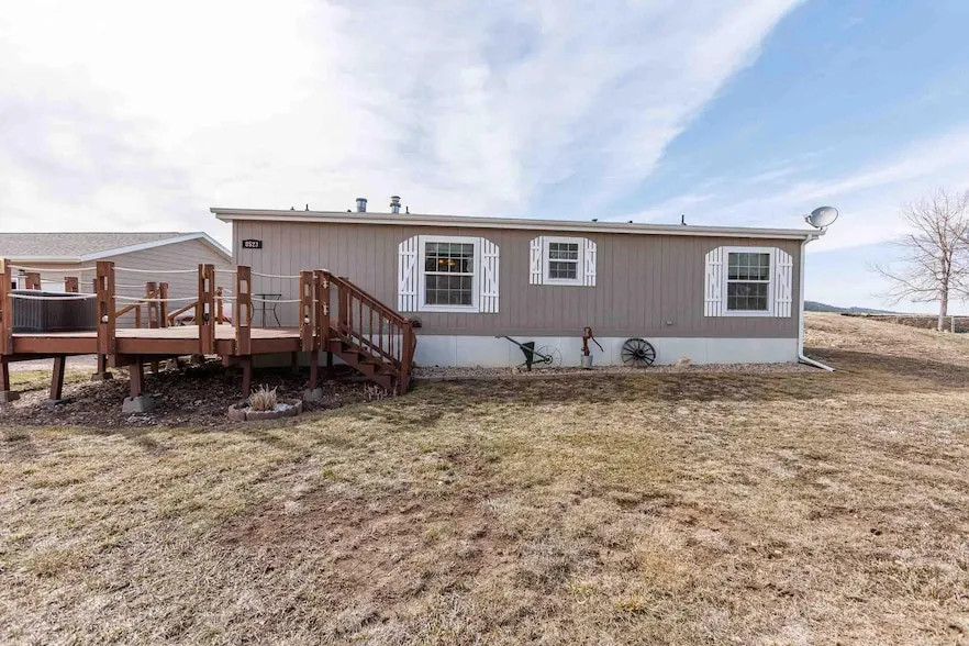 Upgraded comfort, workshop space, and wide-open views all just minutes from I-90! This 3 bed, 2 bath manufactured home sits on 1.06 acres with a smart, open layout and a long list of updates. The spacious 28x35 detached garage was built about 10 years ago with 9 walls plenty of room for vehicles, toys, and tools. An oversized shed, added roughly 3 years ago, is set up as a fully functional workshop. Inside, you ll find newer laminate and carpet throughout, plus a fully updated primary bathroom with brand new flooring, a walk-in shower, and a sliding barn door. A sauna is included, perfect for winding down after a long day. The home has a permanent foundation with an engineering certification already on file. The roof and back Pella windows were replaced approximately 7 years ago. A 4-wheeler with blade stays with the property for added convenience whether you're tackling the driveway or exploring the area. This one is clean, move-in ready, and packed with the extras that make life easier. Call me or your favorite agent to take a look at the move in ready home. Listed by Falina Selchert with Real Broker LLC 605.759.0808
