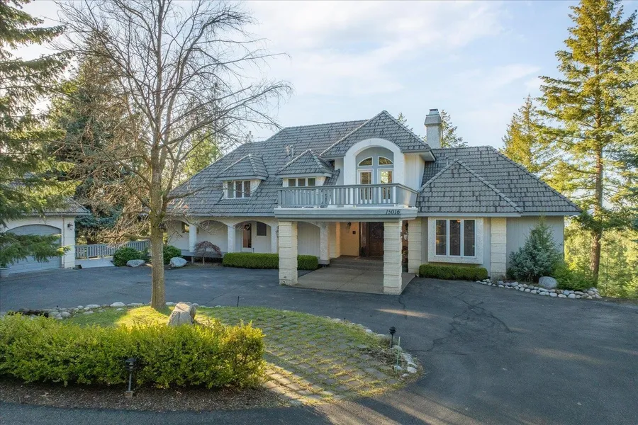 Jon Saylor designed French Country-inspired estate on 1.06 acres w/ trees, views, & a cozy fire pit. A true architectural gem w/ steep rooflines, arched windows, & stone accents. A grand porte-cochère welcomes you to soaring vaulted ceilings. Natural light pours through oversized windows, showcasing the stunning setting. 4 bedrooms,+executive office, main floor primary suite, formal living & dining, TV room, Chef's kitchen: Sub-Zero fridge/freezer, Wolf cooktop & oven. The open-concept layout connects the kitchen, dining, and great room. 2nd Floor: sitting area, 2 bedrooms w/ shared en-suite, & a sunny plant room w/ deck access. LL walkout features a guest suite, two baths, pool table area, custom bar, hot tub room, and workshop. Step outside & enjoy lush landscaping, scenic views and entertaining decks.