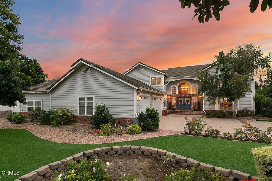 Conceived of the drama & the romance of an exquisite New England Estate, this estate is located on over an acre in the exclusive Rancho Santa Rosa neighborhood of Santa Rosa Valley. Electronically controlled front gate opens to this private retreat with generous sized driveway, double deep potential 6 car attached garage with 50 AMP charging station for your electric vehicle. Additional 20' x 28' 2 car detached garage with space to satisfy the most distinguished car enthusiast or hobbyist. RV or boat space on side yard. Separate attached garage workshop measures approx. 20' X 30', 9-foot ceilings and AIR VAC shop system. Workshop flooring is engineered vinyl with an upgraded cork floor base and moisture barrier underneath providing ideal working conditions. Gourmet island kitchen remodeled featuring oak cabinetry, 48' KitchenAid built in refrigerator, WOLF 6 burner gas range and double oven. WOLF warming drawer, Bosch Stainless dishwasher, pot filler kitchen faucet, custom back splash, granite counter tops. Refrigerated wine cooler and service bar with bar sink. French doors open to beautiful back covered patio. Gorgeous plantation shutters overlooking beautiful garden & mountain views throughout. The primary bedroom suite with separate sitting area, walk in closet, fireplace with sunken tub, and separate shower. Fireplaces in family room, primary suite, & living room. Distinguished architectural bearing with liberal use of enduring wood flooring. Downstairs guest quarters with fully remodeled bathroom. Generous sized secondary bedrooms and storage. The masterful architecture offers luxury designed to seamlessly combine indoor and incredible outdoor living spaces. Meticulously cared for grounds are water smart, decomposed granite walking paths, custom built gazebo, dedicated equestrian area and private tennis court. New 12 x 12 garden green house. The grounds include an herb garden, a personal orchard with two fig trees, two peach trees, one apricot, one apple, two persimmons, one blood orange, one tangerine, one avocado tree. Gorgeous plumeria, bougainvillea, a succulent garden, and easy to maintain water feature with lily flowers. Assorted mature shrubbery line the walking paths. One hundred mature roses on the property and the entire acre are on drip or automatic sprinkler system for efficient no waste watering. Owned solar panels. Award winning Santa Rosa Technology Magnet School. Your private retreat in beautiful Santa Rosa Valley.