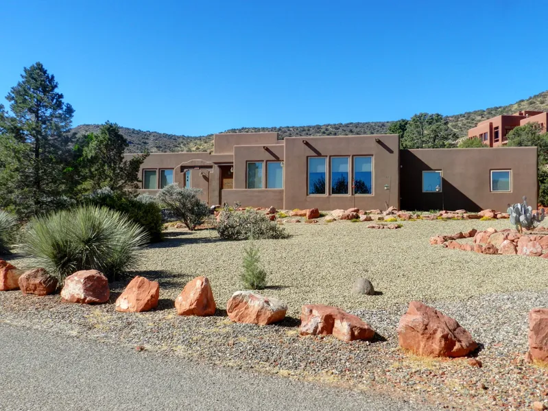 This is a beautiful well-maintained 4 bedroom 3 bath Santa Fe Style home. The unobstructed views out of the huge wall windows expose the red rock views from the living room, great room, kitchen, and breakfast area. Not only are the views stunning but the wildlife that walks up to the great room windows is unbelievable. The 15-foot ceilings in the great room, kitchen, living room and dining room exude elegance, the 3-sided gas fireplace adds to the ambiance in the great room same with the Kiva fireplace in the living room. This home features 3 patios, the front is a spacious outdoor entertaining area with red rock views to watch stunning sunsets, also a fantastic space for star gazing. The smaller back patios have great views of the back plateaus and mature trees. The warm wood ceilings