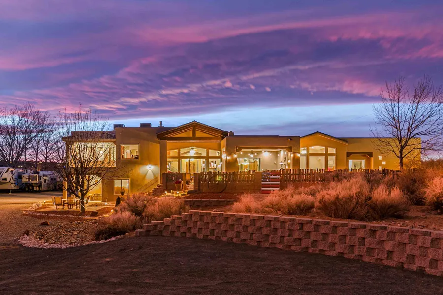 MOTIVATED SELLER! This exquisite custom home is located on a tranquil cul-de-sac in Corrales. A sophisticated mix of traditional Northern NewMexico architecture with modern comforts. Soaring elegantwood ceilings welcome you into the spacious family room.Breathtaking views of the Sandia mountainsfrom the wall of windows invite you to relax in front ofthe fireplace. Gourmet kitchen located in the center of thehome, making entertaining a delight. Five covered patios, anincredible outdoor kitchen, and recent xeriscaping allow you torelax and take in the panoramic views of the Sandia mountainsand city. Luxurious master suite located on the main floor, dogspa, and artist studio/separate office reflect attention to detailthroughout the home.