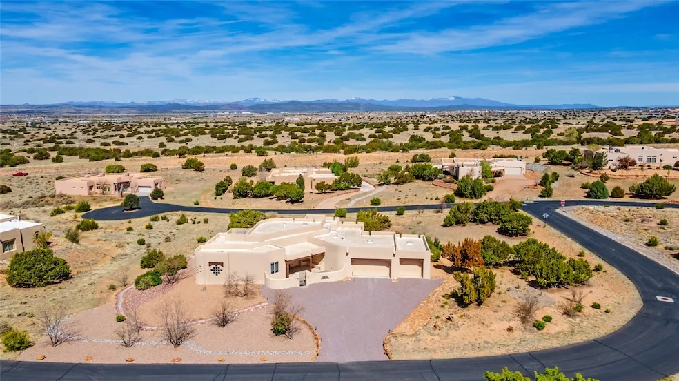 Welcome to this exceptional one-owner custom home, nestled in the coveted Estates section of Rancho Viejo. Set on a generous one-acre view lot, this thoughtfully designed single-level home offers 2,369 square feet of refined Southwest living. From the moment you enter, you ll be captivated by the stunning wood ceilings with vigas, artful nichos, and built-in shelving that blend function with authentic Santa Fe character. A dramatic two-sided gas fireplace anchors the living and dining areas, where a curved wall of windows frames breathtaking Jemez Mountain views. The well-appointed kitchen is a chef s delight, featuring custom wood cabinetry, luxurious granite counters, a stone tile backsplash, and premium appliances including a Dacor cooktop and wall oven, plus a Bosch dishwasher. The home s smart layout offers privacy and comfort, with a dedicated office and a spacious owner s suite in...