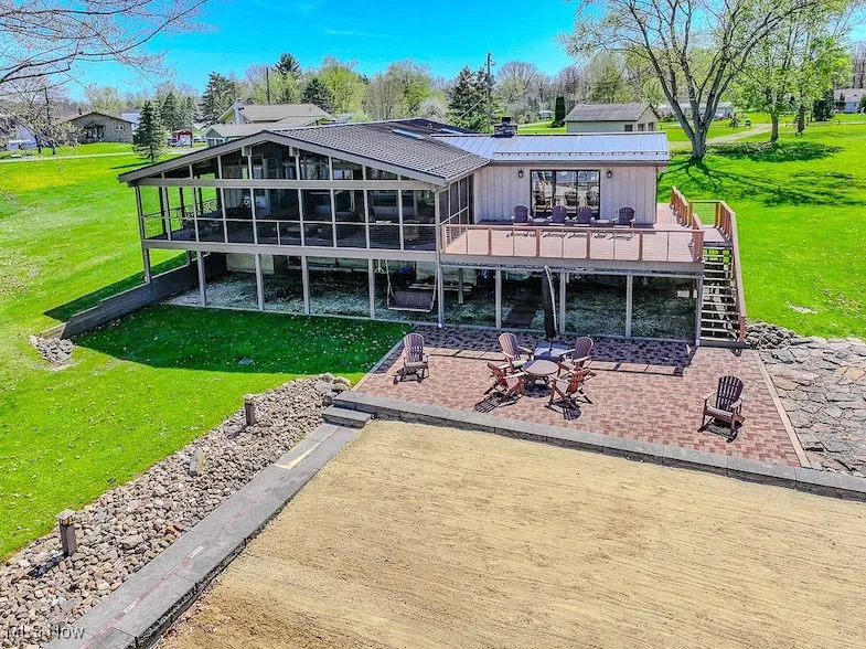 Welcome home to one of the most desirable waterfront properties in Roaming Shores! With approximately 175 of lake frontage, this serene retreat is nestled on just over 1 acre of gently rolling landscape a peaceful haven that culminates in the ultimate luxury your own private sand beach. Offering endless opportunities to soak up the sun and unparalleled convenience of launching your kayaks & paddleboards directly from your backyard. The natural cove of the waterfront also provides the perfect dock the boat lift and 2-bay floatable jet ski dock helps keeps your watercraft protected. This stunning 4-bedroom, 3-full-bath ranch home is bathed in natural light, featuring soaring vaulted ceilings and breathtaking sweeping views. On cooler evenings, picture yourself cozying up to the warmth of the wood-burning fireplace. The magnificent screened-in porch is an absolute dream. Boasting an impressive size of almost 700 sq ft and beautiful vaulted wood ceiling - an ideal space for entertaining guests or simply enjoying your morning coffee while the sunrises over a tranquil lake. The maintenance free composite decking of the porch continues to the sundeck giving you and your guests plenty of room for lounging and grilling. The basement features a large utility room plus a storage room for all your water sports gear. The finished portion of the basement expands your living space and offers an excellent recreation area for family and friends with a walkout directly to your rear patio, private beach, and docks. Peace of mind comes with a newer heat pump/ac and durable metal roof - ensuring years of worry-free living. This isn t just a home; it s a lifestyle & endless holiday! Community amenities include a clubhouse, 2 heated swimming pools, 2 beaches, tennis/pickleball & volleyball courts, pavilion & picnic areas, waterfront dining & full-service marina! Roaming Shores / Vacation Home / Lake Front / Lake House / Beach Front / Private Beach / Vacation Home / Boat Lift