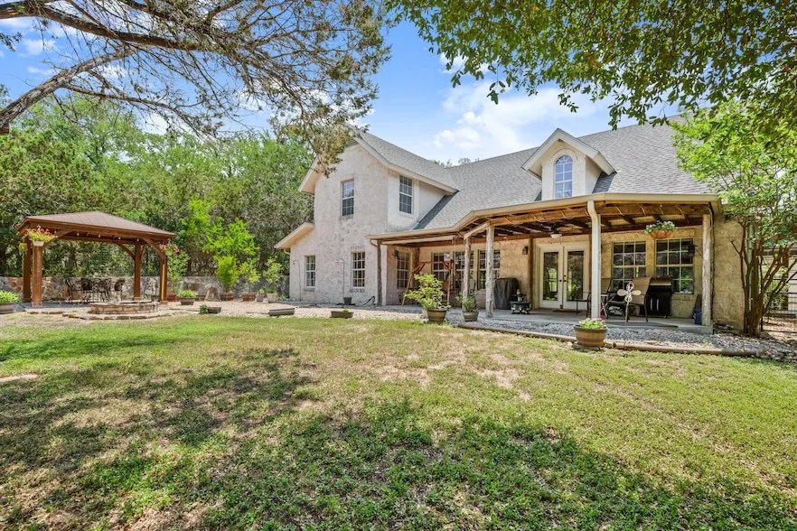 Looking for the peace of country living - and a HUGE workshop - without giving up quick access to town? Tucked at the end of a quiet cul-de-sac just minutes from downtown Kyle, this French country dream offers the perfect blend of elegance, function + flexibility. Step inside to a custom-designed home bursting with character white stone exterior, romantic schmeer finish, intricate wood door casings + a handmade front door w 1890s stained glass from England. A dramatic spiral staircase of oak + iron anchors the living space, surrounded by vaulted ceilings + etched stained concrete floors that bring both style + durability. The home includes three spacious bedrooms, a large office with bay windows and glass French doors + Cat-5 wiring throughout. The oversized kitchen was fully remodeled in 2020 w new quartz countertops, stainless appliances, backsplash, sink + an abundance of cabinet space. A separate mudroom/laundry/harvest room offers even more storage, a second fridge area + sink. The primary suite is a retreat of its own massive, w a walk-in closet, remodeled bathroom, vessel sinks + a secret compartment to the HVAC closet. Cozy touches like a plumbed-in pellet stove make it feel like home year-round. Just steps away, the 1,200sf garage/workshop is a true showstopper metal-framed, with two 10x10 doors, a reinforced 4,000 psi slab (with car lift pads), 220V power, extensive LED lighting, internet, two HVAC units + honeycomb + foam board insulation. It s everything you need for a dream workspace, studio, or next-level hobby shop. Outside, enjoy 1,000sf of covered front/back porches w cedar beams and fans, a gazebo w solar cafe; lights, stone fire pit, and gorgeous dry-stack walls. Fully fenced backyard backs to 130 acres of undeveloped woods full of deer, owls, birds even tortoises. An irrigated orchard includes plums, citrus, olives + more. Hot tub, shed, greenhouse, massive parking + unincorporated zoning round out this unforgettable property. Welcome home.